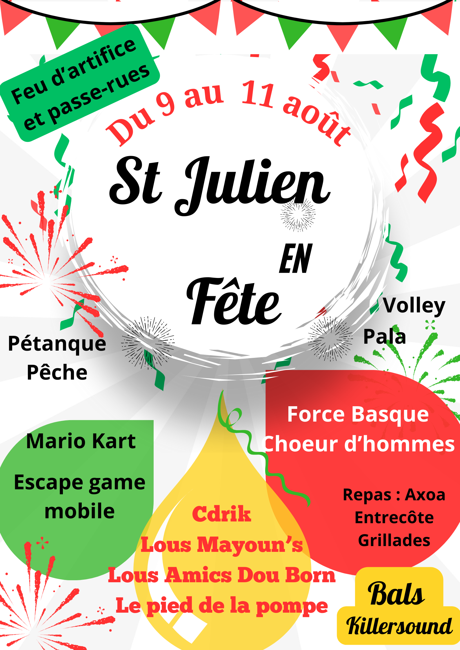 Concerts gratuits, Repas animés, Feu d'artifices le dimanche pour la clôture des fêtes