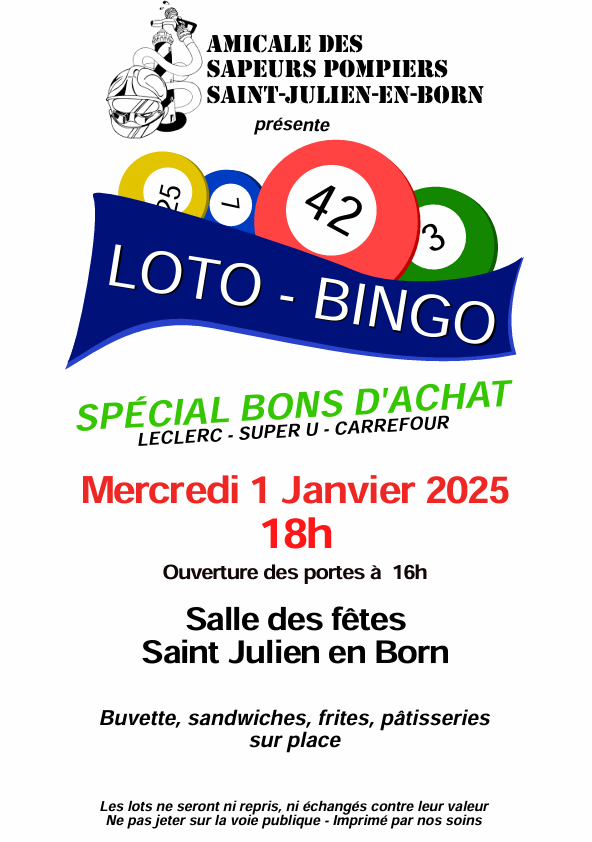 LOTO DES POMPIERS Publié le 19 octobre 2022 / Dernière modification le 06 octobre 2025 LOTO DES POMPIERS Publié le 19/10/2022 - Dernière modification le 06/10/2025 Le jeudi 01 janvier 2026 de 18:00 à 23:00 LOTO DES POMPIERS LOTO des sapeurs pompiers de Saint Julien en Born à 18h00 à la salle des fêtes.