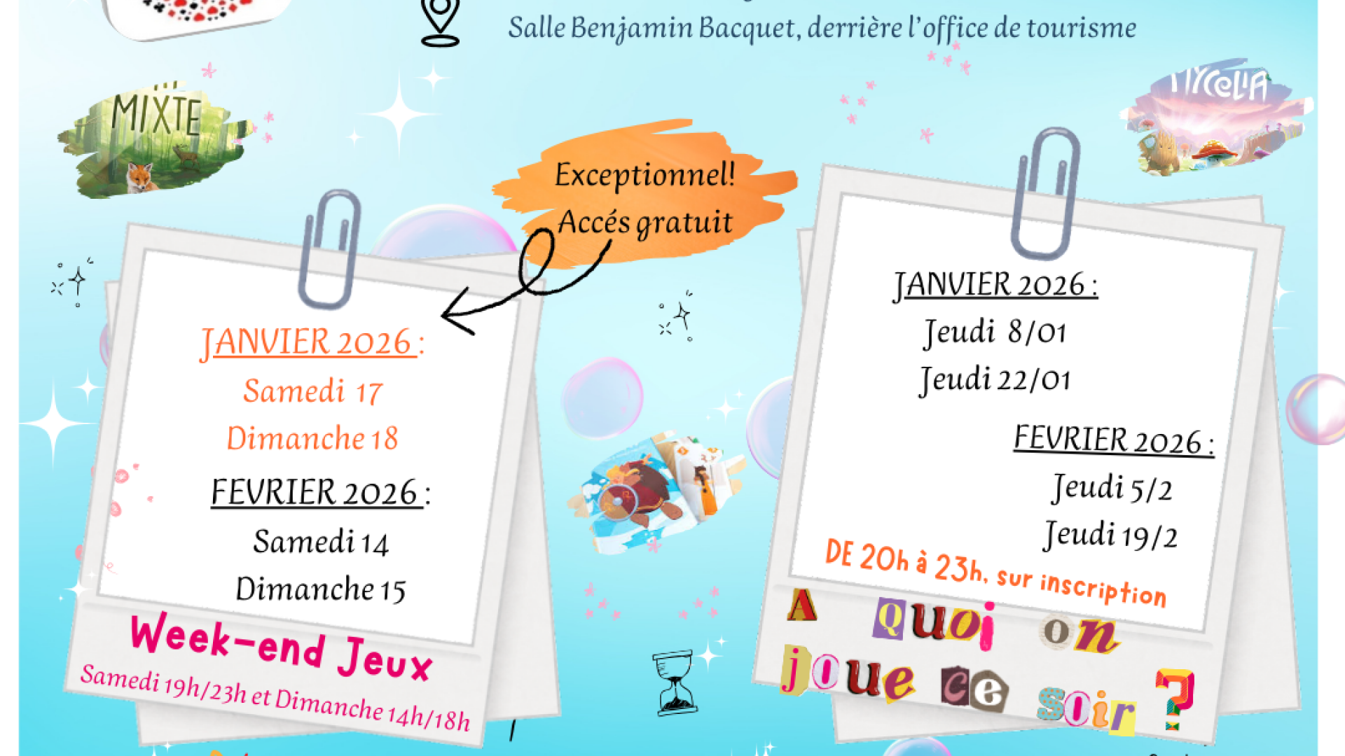 Soirée jeux de 20 à 23h à la salle annexe de la salle des fêtes à Saint Julien en Born , accessible aux adhérents annuels et temporaires, sur inscription via les réseaux sociaux jusqu'au jour J, 12h.