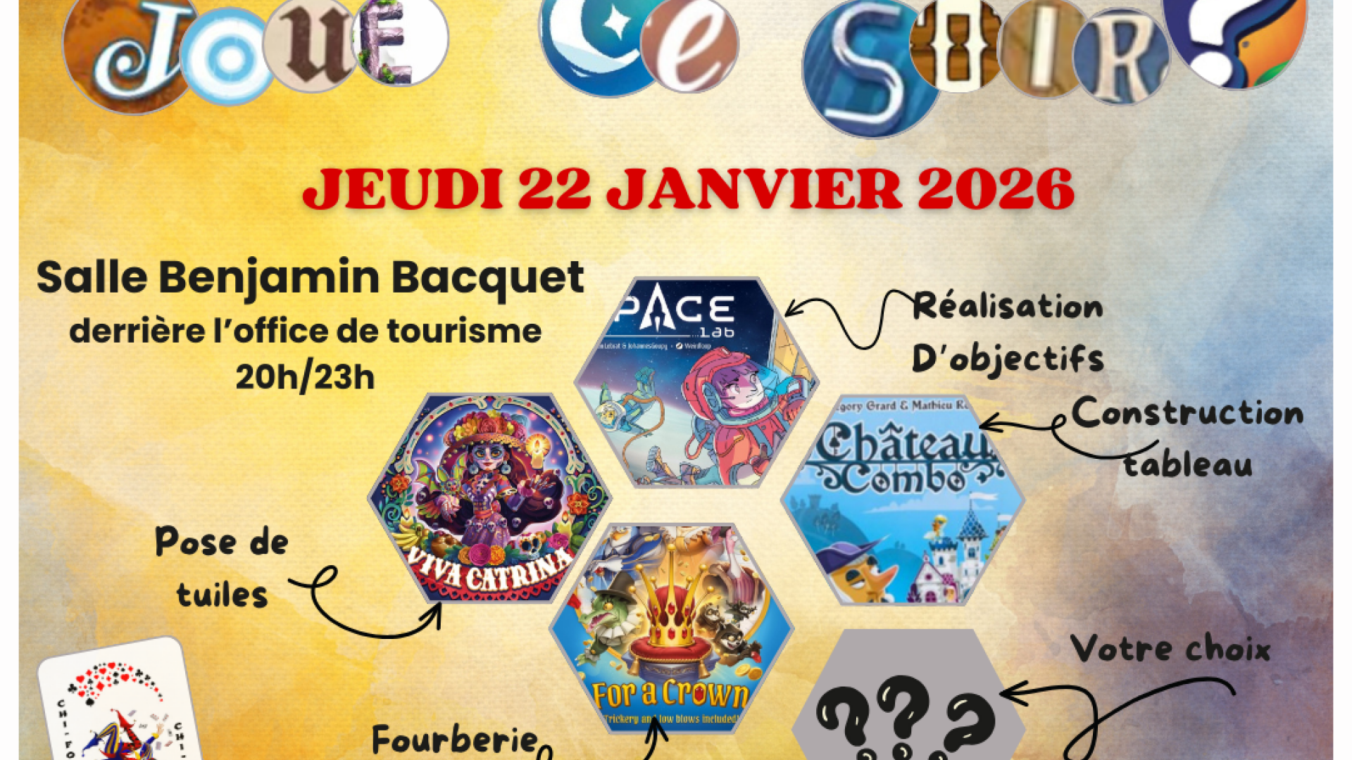 Soirée jeux de 20 à 23h à la salle Benjamin Bacquet , accessible aux adhérents annuels et temporaires, sur inscription via les réseaux sociaux jusqu'à jour J à 12h.