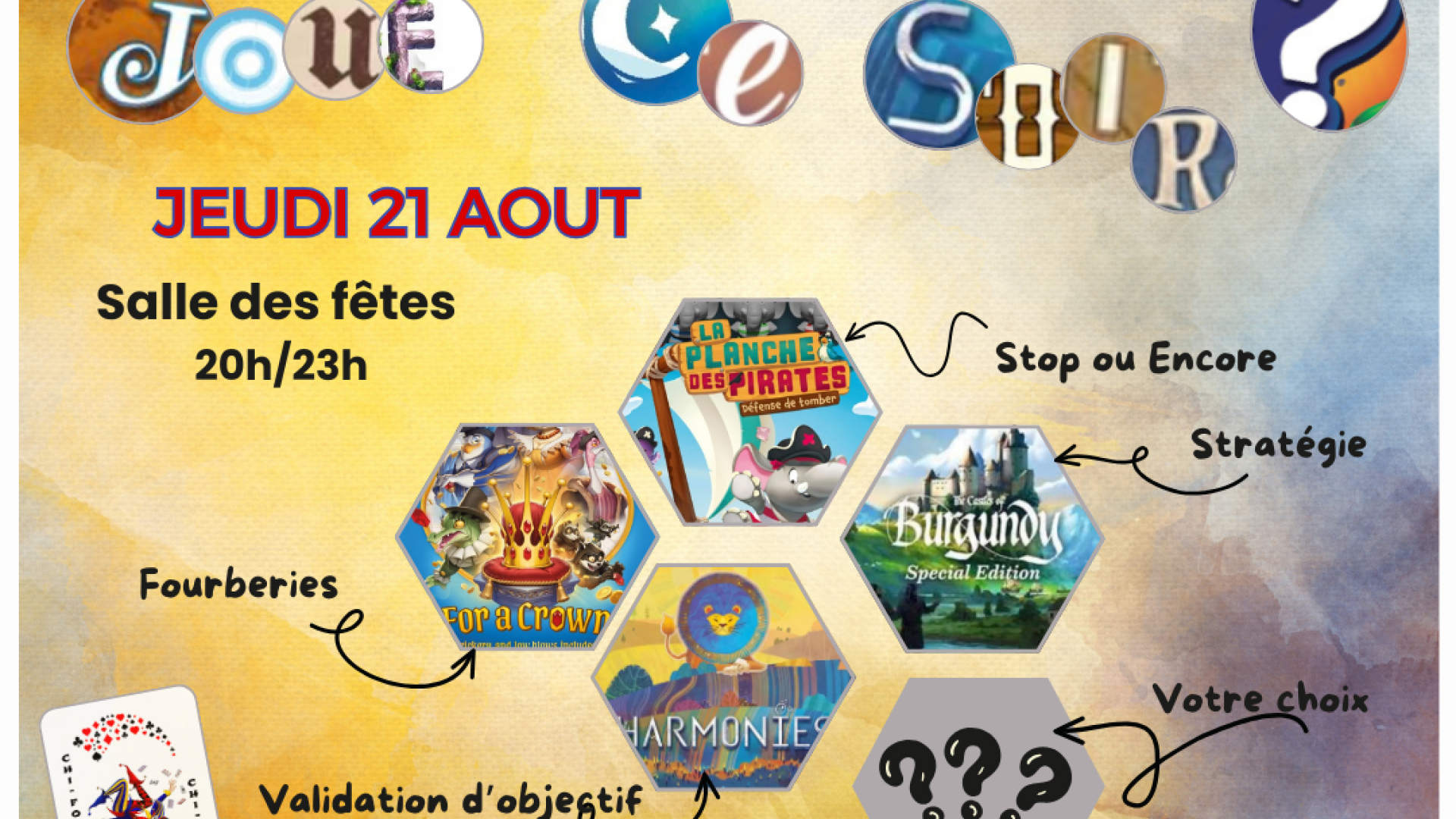 Soirée jeux CHI-FOUS-MI Publié le 26 juin 2025 / Dernière modification le 14 août 2025 Soirée jeux CHI-FOUS-MI Publié le 26/06/2025 - Dernière modification le 14/08/2025 Le jeudi 21 août 2025 de 20:00 à 23:00 Soirée jeux CHI-FOUS-MI Soirée jeux CHI-FOUS-MIJeux d'ambiance GRATUITHalles de saint Julien en Born